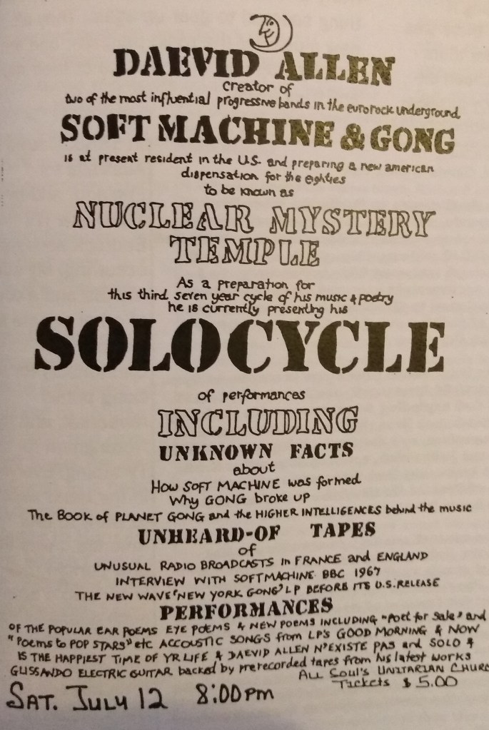 During 1980, I worked extensively with Daevid Allen, who was touring with his Divided Alien Clockwork Band show – sometimes opening the show with a poetry reading cum history lesson, and sometimes with a lady vocalist accompanying herself on auto-harp. I think there were some 35 dates on his four cross-country treks – driving all the while – sometimes a broken-down station wagon, sometime a hired lorry, and God knows what else. I think Daevid was living in his car for a while, especially when it was broken into in Los Angeles and his guitar was stolen.