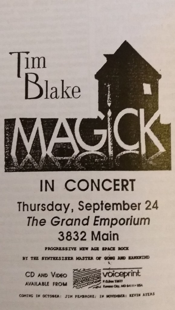 1992 was filled with diversity: a solo Gilli Smyth tour occurred in July, and our second Tim Blake tour in September and a bit of October. Tim’s last two dates coincided with the first two dates by members of Finland’s Wigwam. These two dates, Detroit and San Francisco, I also managed to attend. Now I know that Finland (and even Finchley, where Jim Pembroke is from) is a long way from Canterbury, but I’m quite sure that Canterbury afficionados could ery much appreciate the immense talents within any version of Wigwam. For our tour, often mistakenly promoted as a Wigwam gig, Jim Pembroke played electric piano and Pekka Rechardt played electric guitar, some of the finest heard on the planet.