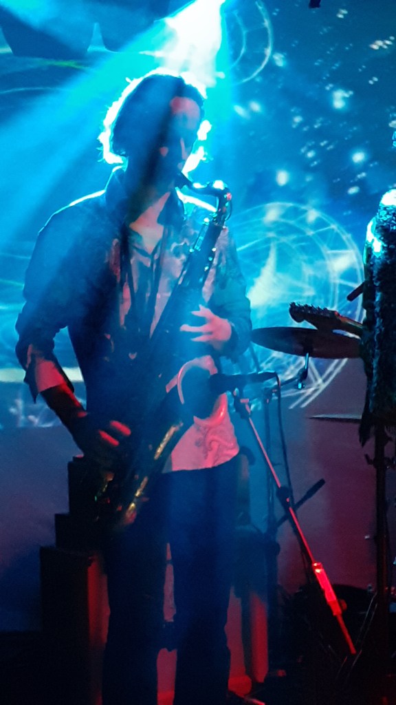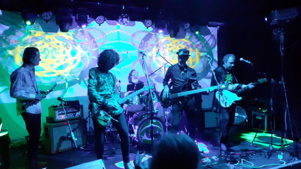 This was 13 gigs into a continuous 14 day stretch on the band’s current UK tour, performing nightly 2 and a half hours sets, and one might expect the band to be flagging. On the contrary: Jonny Greene (of the essential support network, the Gong Appreciation Society) reckoned the band had just about reached their peak the previous night in York, whilst tonight a revved up band were beaming and talkative afterwards. Reports had been consistently coming in of this tour showcasing the best performances of the current band, and it would be interesting to see whether tonight’s gig would stack up.