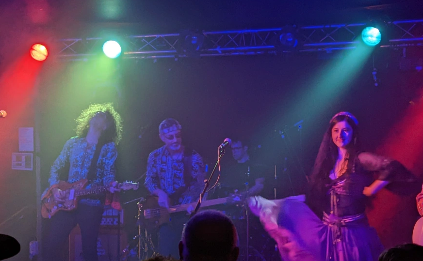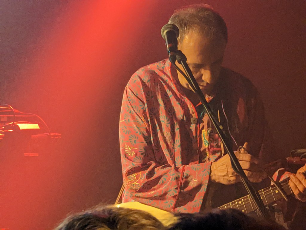Gong are in the process of putting down tracks for the eagerly awaited third studio album from this formation, it feels like it’s been a long, COVID-induced break in transmission since the last, although there have been plenty of gigs in the meantime, honing the set and confirming the band’s self-confidence in the very strong material they have written since 2016. If you’d just emerged from a 1990s or 1970s fug, you’d certainly recognize the Gong vibe even if you weren’t conversant with the material. Familiar recent paths are trodden: three quarters of ‘The Universal Also Collapses’, with the reflective opus of ‘Forever Reoccuring’ as its opener, the snappy ‘If Never I’m and Ever You’ to follow, and best of all the manic, tribal ‘My Sawtooth Wake’, where in amongst a tightly curated rhythmic romp, Fabio Golfetti’s glissando seemed to be woollier and slightly more sinister than normal, whilst Ian East added wild, Windo-esque saxophone to add to a sense of nihilism. The previous album, ‘Rejoice I’m Dead’ was well represented too: Daevid’s legacy track ‘Kapital’ receiving its customary rousing outing, alongside ‘Rejoice!’ itself, from its spiky call and response intro all the way through to the exultant guitar centrepieces. I might bore myself somewhat in continuously raving about the Kavus Torabi guitar solo on this track, but if I could bottle up all the different versions of it, I’d happily spend an hour or two comparing their merits: it’s a breakneck but tortured exploration of the fretboard, like a Phil Miller on speed, where every note is fleetingly considered for its gut-wrenching impact before flying off elsewhere.