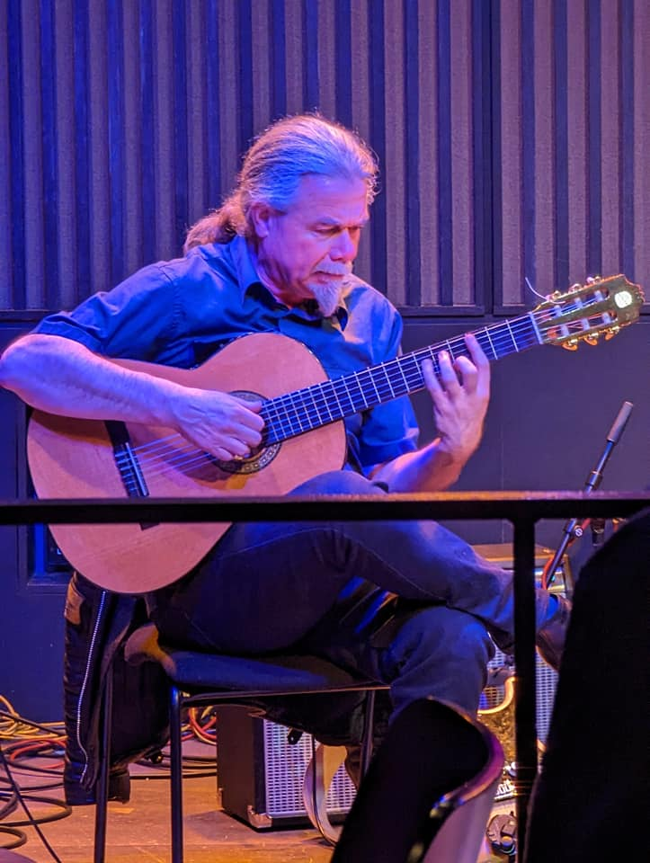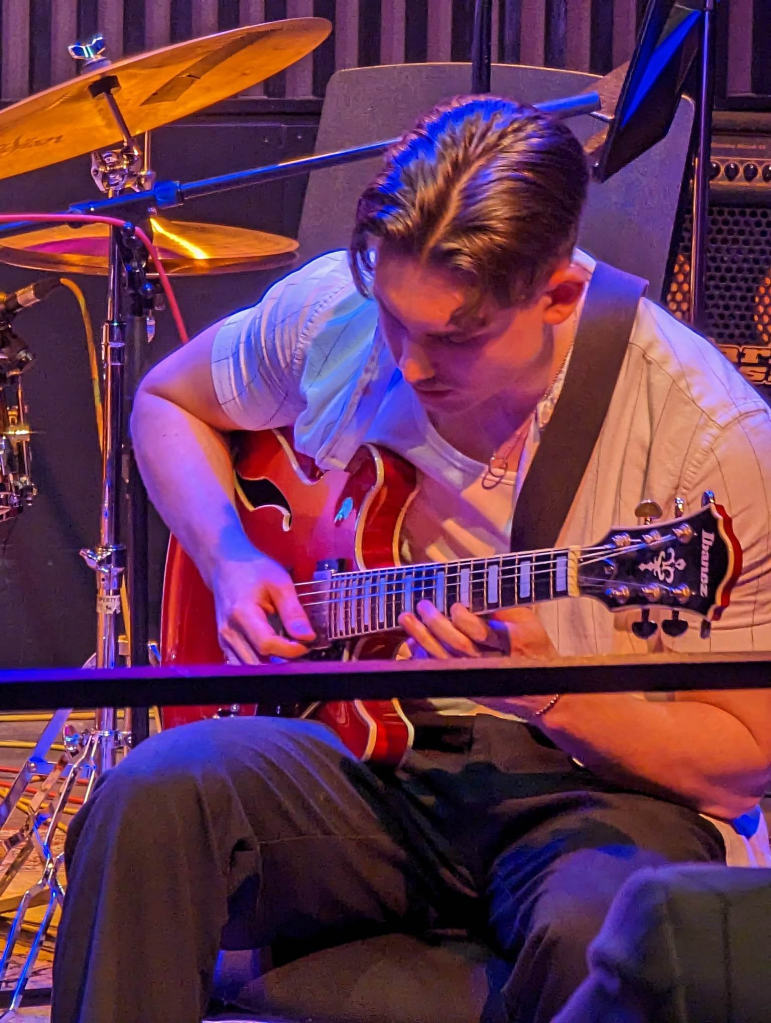 After a short break, the student performances began, each taking what appeared to be around 10 minute segments of various parts of the Miller repertoire. The nature of the music surprised me: this was almost an antidote to the Phil Miller memorial gigs in London in 2019, where a cast of many hammered out tightly scored compositions in the various denominations of musicians who’d been associated with Phil through his career. Tonight’s performances were largely singular and highly interpretative – at times almost only nodding to their original sources, but all reflecting facets of Phil’s playing or compositions in one form or another. It was uniformly excellent and at times quite breathtaking.