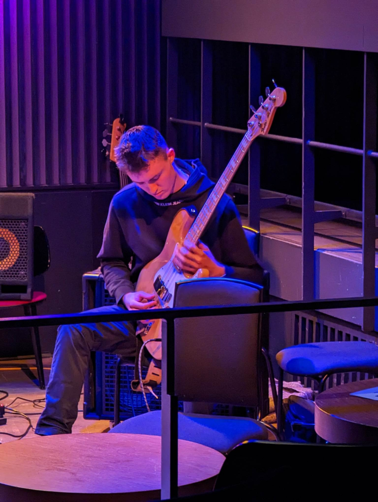 Oliver Canham opened up with a very impressionistic version of ‘Phrygian Blues’, in many ways the most adventurous of tonight’s performances with great use of dynamics and a real creative feel, ending with a lovely looped outro which faded beautifully around the room; Alfie Dean performed a lengthy version of ‘Truly Yours’ with incredible poise and sensitivity; Adam Roberts, tonight’s only student bass player produced an adventurous rendition of ‘God Song’, in two parts, the first a relatively straight picking out of the melody, the second soloing beautifully to a looped backdrop. Timothy Alan in performing an interpretation of ‘Green and Purple’ eked out a series of guitar lines so quintessentially Phil – no single note was wasted – that I was quite transported (and forgot to photograph the performer). It also somewhat brought the house down and one might have felt, in one’s own subjective way, that this rendition could not be topped. But the eventual winners, the only duo (Joseph Hiles and James Coni) stole the show with their mesmeric ‘Digging In’, with intertwining acoustic guitars trading themes.