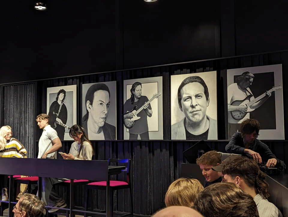 A few concluding thoughts: great to be able to chat to Fred and Herm and Lynette (who were all so instrumental in organisign those memorial gigs) and to meet Mickey and Jim who I’ll hopefully see again with the Fred Baker Trio. Great also to bump into an old Facelift writer – Martin Mycock, who produced many a fine piece in the magazine’s early days – we worked out we’d not met since convening at a Richard Sinclair RSVP gig in Chester in the Nineties. The walls were dominated by Herm’s 10 portraits of Phil – the miniatures you will have seen as part of the promotional stuff for this concert are extraordinarily almost photographic in their nature, but tonight was a chance to see them in their full glory, I would estimate each is over a metre in length; also it was lovely to hear Phil’s music piped through the wires before, after and between sets, a real treat. But the main thing I would say is to encourage any fans of Phil’s work to make it to the next Guitar Prize night – this was a night of unexpectedly high craftmanship and innovation towards the work of one of our scene’s giants.