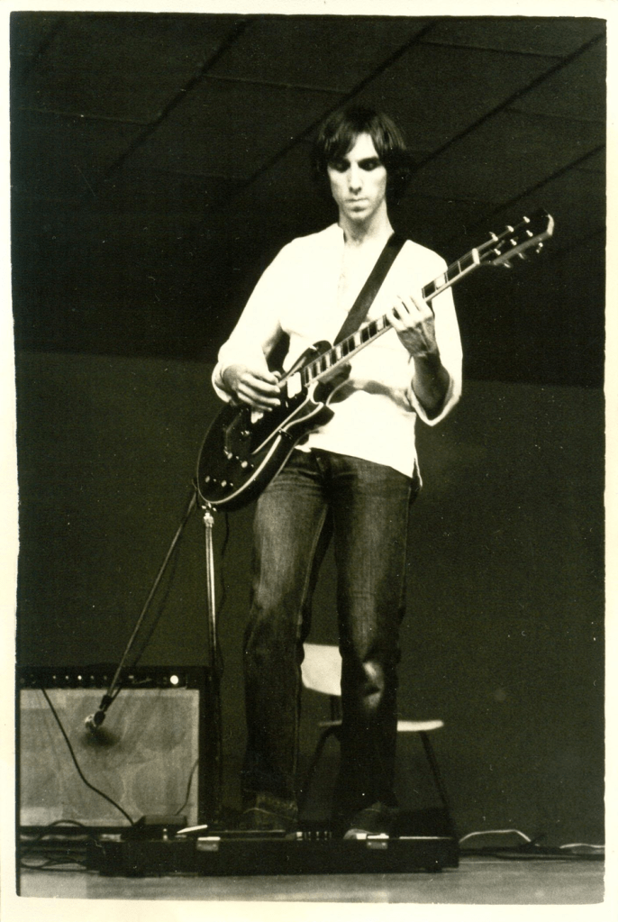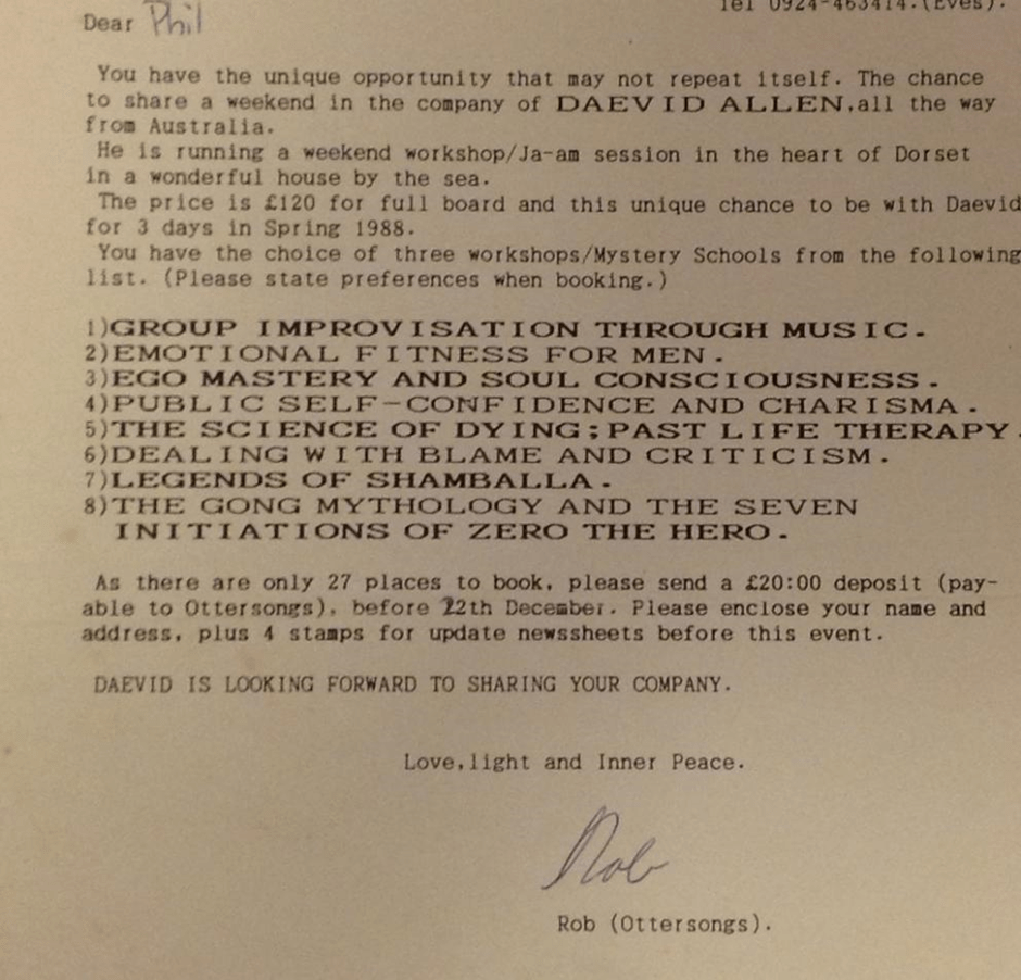 So probably this was going to be his last tour too. But he’d gone back to Australia and we had Glastonbury to play and then he wrote , ‘I don’t have very good news because I fell on the veranda outside my house in the garden, I fell and I broke my (collar bone) and I don’t know if I can play guitar for Glastonbury. But now as we have Kavus playing guitar we have three guitars, so I can just play the glissando, so let’s see.’ He put a kind of (support) to keep things in place but this caused friction on his skin and because Daevid had a certain skin sensitivity, (he had a lot of problems with the sun because was very white), there was a problem – it wasn’t healing because of the friction.