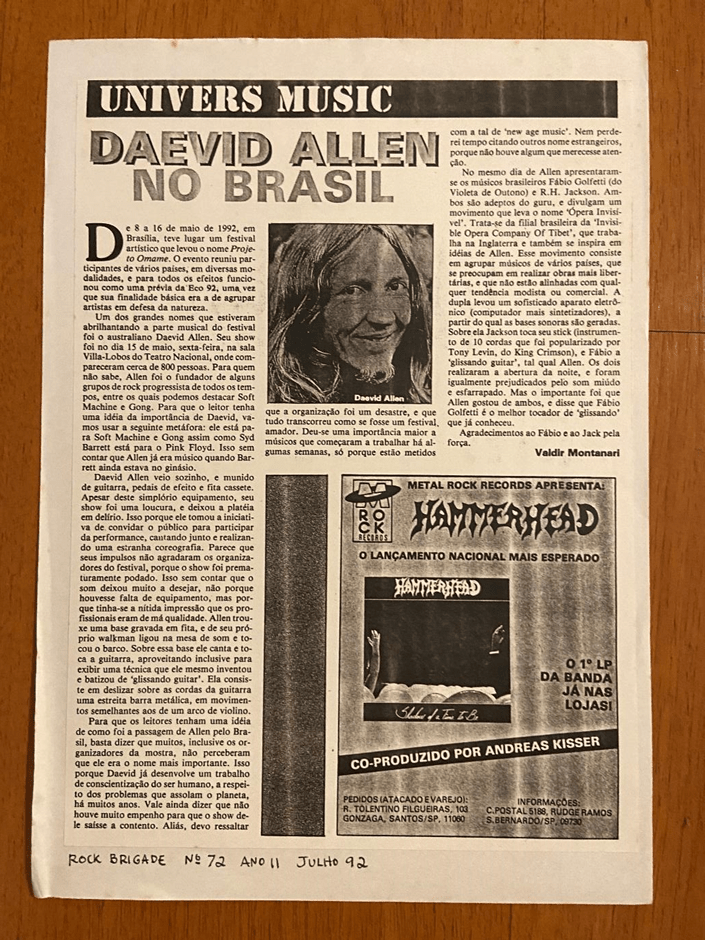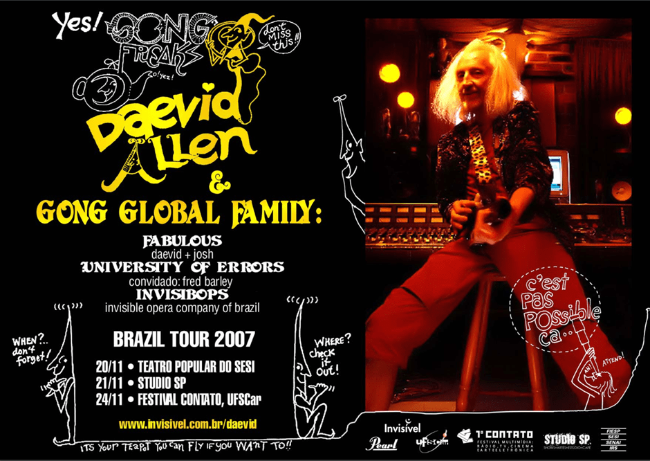 Daevid and me became friends after Daevid came to Brazil in 1992 (see previous section). We kept in touch. For some reason in one of my communications, in 1998, I said, ‘if you need a guitarist I am available’. He replied that for the next tour they already had a guitarist, which was Mark Hewins.