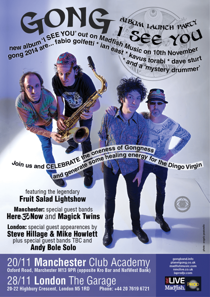 But I have been a fan of this scene since I was 14. I like the trilogy (‘Flying Teapot’, ‘Angel’s Egg’, ‘You’), I was inspired by this Gong philosophy. I’m not sure when Dave and Ian had a connection with Gong philosophy before, nor Cheb. But when Ian plays his saxes it’s instantaneously Gong, Cheb could play Pierre’s parts perfectly, Dave is an amazing bassist that could be in any incarnation, Kavus is a Gong fan, but, the same as Tim Smith (Cardiacs), loves the ‘Om Riff’ because of the riff itself, as he says: the best riff ever written! But this Gong has nothing to do with the mythology (although we love it), without Daevid Allen it is not the thing to do to continue (or perform) the trilogy.
