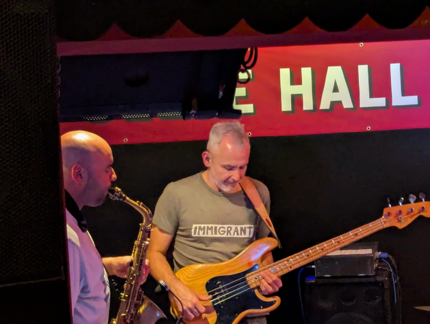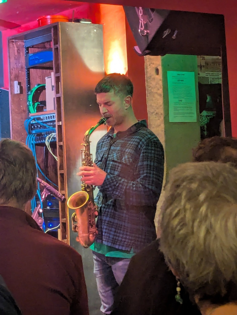 The band are a Mercury-nominated outfit, recently reduced to a four piece containing two saxophonists, electric bass and drummer. Instrumentation is minimal – Mark Holub, (who makes the announcements, or at least spoke wryly between sets), deftly operates on a basic kit with Cutler-like omnipresence, and the two reed players play solely baritone and alto respectively. One might worry about the ‘middle’ vacated by their erstwhile keyboard player – but great washes of echoed sounds often permeates between the opposing saxes Chris Williams and Pete Grogan – think a less manicured Delta Saxophone Quartet. Their collective collages are as much a part of the palette as the presence of the astonishing Liran Donin – often using the bass as a lead instrument: high up on the fret board crafting melody, or grinding out memorably dexterous rhythms.
