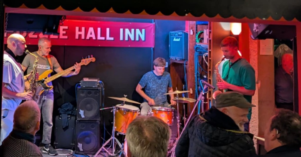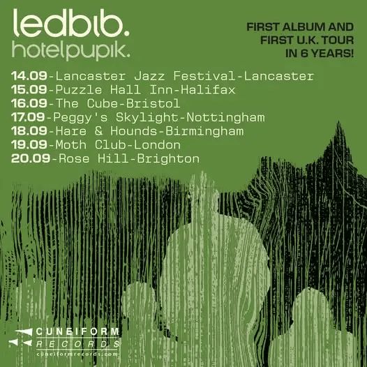Promoting their new album ‘Hotel Puplik’, Led Bib were playing the Puzzle as part of a short UK tour, an intimate venue, a proper old boozer, with its monthly jazz gigs, characterised by a pass-the-hat policy rather than entrance fee, augmented by this unscheduled Monday night performance, one of the finest I’ve seen in recent years. I’d most recently been at the Puzzle for a superb Gary Boyle gig where post-gig he related some slightly scurrilous stories about the Bilzen festival back in 1969 that he’d played at with Brian Auger (alongside Soft Machine). Since then Chris Martin had dropped in for a solo set a few weeks previously, prior to a few dates in somewhat larger arenas with Coldplay.