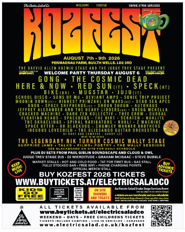 2026 will once again see Gong headline Kozfest, that little slice of space-rock infused psychedelia now in its new home in the stunning surrounds of Builth Wells in deepest mid-Wales after over a decade in various locations in Devon. Kozfest is steeped enough in Gonglore that it has a main Daevid Allen stage: Soft Machine, System 7 and Here and Now have all headlined there; whilst associated bands such as Kangaroo Moon, the Invisible Opera Company of Tibet, the Glissando Guitar Orchestra have also been regulars at the festival.