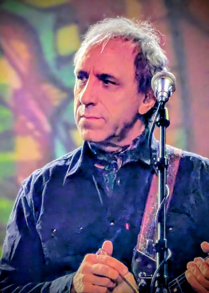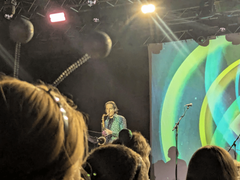 My notes throughout this gig are punctuated by words such as ‘joyous’, ‘upbeat’, ‘celebration’, and indeed the gait of the band was infectious: Dave Sturt beaming throughout, his head often raised to the roof in exultation; Fabio the rock, creating the bedrock of sound on glissando; Kavus a bundle of energy, circling constantly the vast stage, circuiting behind the drum kit, popping up on either side of his sidemen at will. Ian East felt like a maestro tonight, with so many telling incursions as counterpoint or full-throated solos. With such a vast stage, drummer Cheb Nettles was unusually exposed, giving full visibility not just to his highly dextrous, powerful drumming, but an insight into the passion behind his own screaming, high end backing vocals. A colossus.