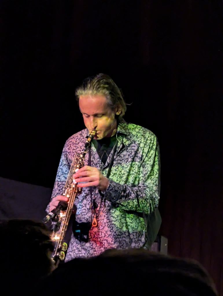 Highlight of the evening for me was an astonishingly vibrant ‘My Sawtooth Wake’, which, since becoming aware of secrets of the track’s origins (it is inspired by the story of revelatory madness of the 1960s lone British sailor Donald Crowhurst) has added, for me, a whole new layer of significances: it’s pounding, unremitting rhythms; its undulating, rocky tempos; even the brief hint of a seagull’s call from saxophone.